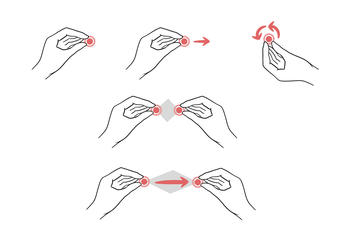 Bausteine können jederzeit über die dauerhaft eingeblendete Hotbar-Leiste erzeugt und gemeinsam im virtuellen Raum angeordnet werden. Das Bauen wird durch natürliche Handgesten ermöglicht: - Durch das Zusammenbringen von Daumen und Zeigefinger einer Hand können einzelne Bausteine gegriffen werden. - Gegriffene Bausteine lassen sich über Bewegungen der Hände frei im Raum verschieben und rotieren. - Greift man ein Modell mit beiden Händen, lassen sich alle miteinander verbundenen Bausteine zusammen verschieben und rotieren. (Konzept) - Mit beiden Händen kann man Verbindungen zwischen zwei Stellen im Modell ziehen. Verbindungsstücke lassen sich, ähnlich wie Bausteine, platzieren und anschließend frei verformen, indem man beide Enden greift. (Konzept)
