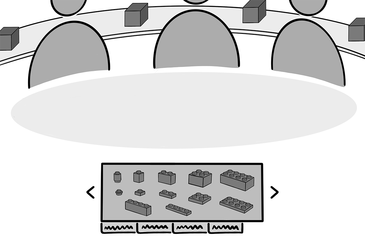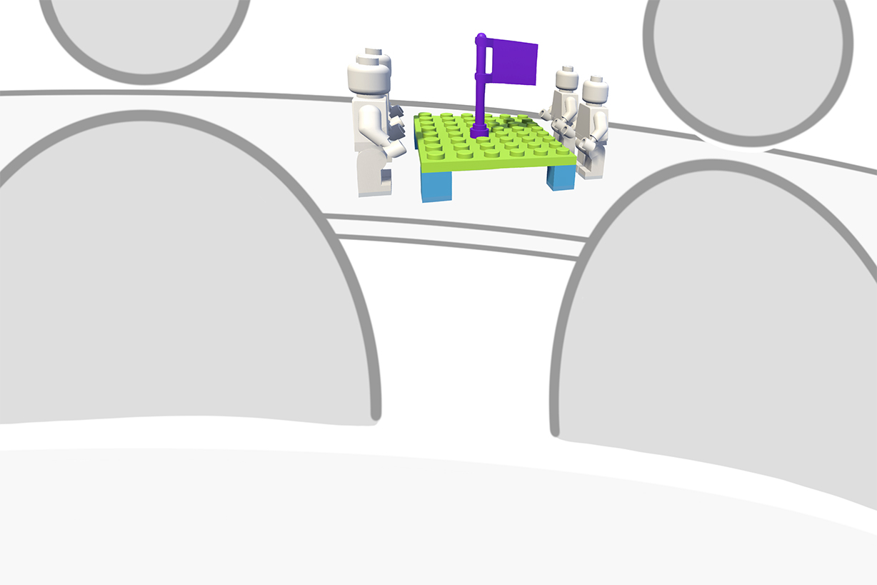 Als Nächstes erhält das Team eine Aufgabenstellung, um die individuellen Reflexionen zu einem gemeinsamen Projekt zu verknüpfen. Als Antwort bauen sie ein gemeinsames Modell und schaffen so ein klares Verständnis. Anhand dessen können sie Maßnahmen beschließen, um ihre Zusammenarbeit zu verbessern.