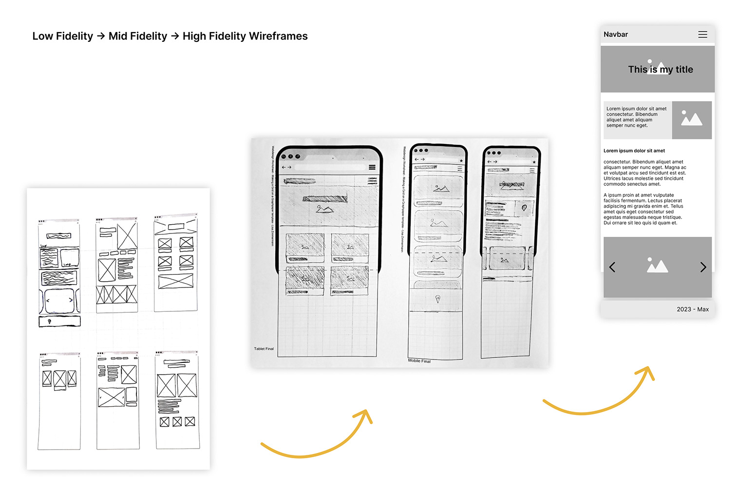 Während des gesamten Projekts folgte ich einem iterativen Designprozess, der mit Wireframes und Low-Fidelity-Prototypen begann, um Layout-Ideen zu testen. Außerdem konzentrierte ich mich auf UI und UX, um eine intuitive Navigation, visuelle Konsistenz und Barrierefreiheit zu gewährleisten. Die Website wurde mit HTML/CSS und Bootstrap umgesetzt, was ein responsives und benutzerfreundliches Design für alle Geräte ermöglicht.
