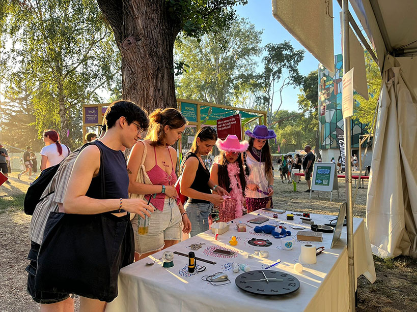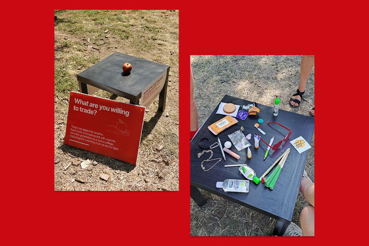 Die Tausch-Station sorgte für großen Andrang: Nach dem Spielprinzip von „Apfel und Ei“ tauschten die Festivalbesuchenden einen Gegenstand gegen den nächsten – immer ein Stück „wertvoller“. Was mit einem einfachen Apfel begann, verwandelte sich nach zahlreichen Tauschaktionen schließlich in ein Massagegerät. Ein spannendes Experiment mit Gesprächen darüber, welchen Wert wir je nach Kontext Dingen zuschreiben.