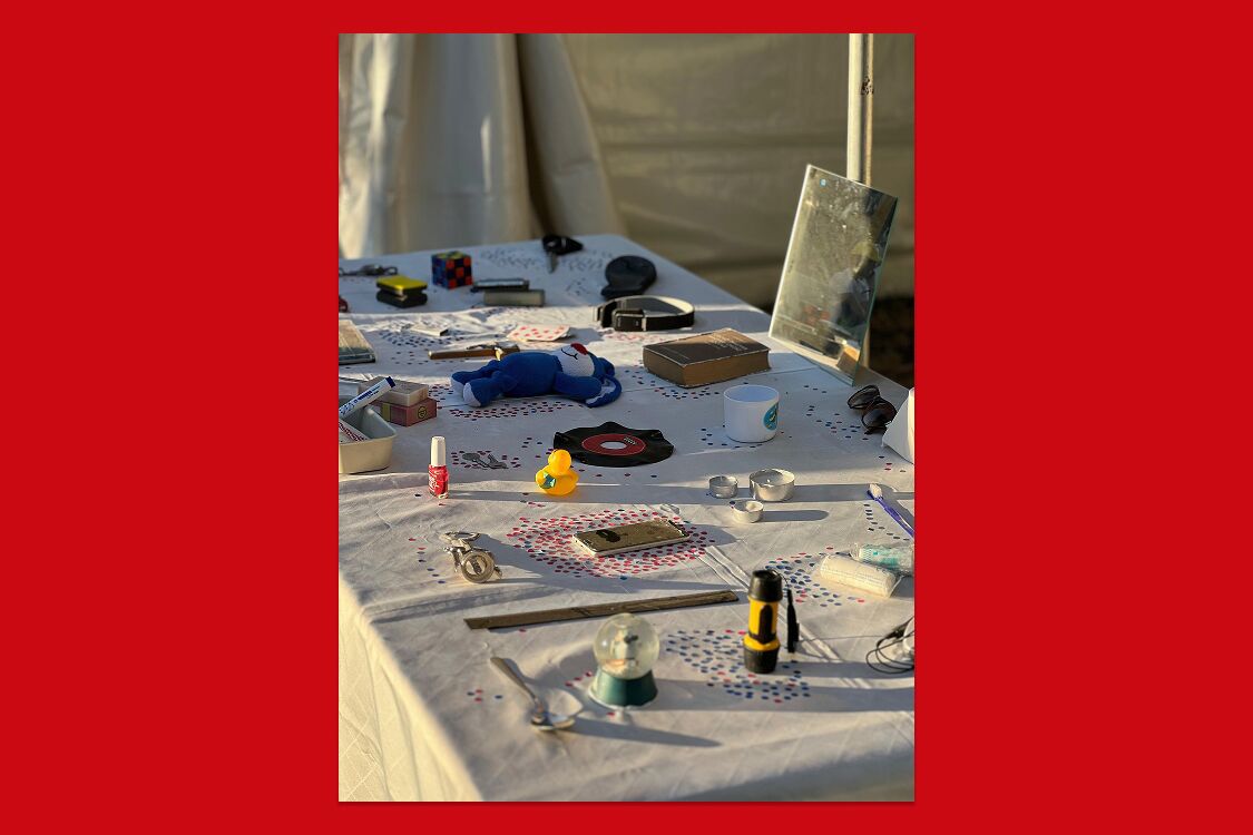 Ebenfalls zu spannenden Diskussionen kam es am Tisch mit kuratierten Alltagsgegenständen von einer Zahnbürste, einen Uhr bis zu einem Kuscheltier. Die Teilnehmenden markierten mit roten und blauen Stickern, welche drei Dinge sie im Notfall aus einem brennenden Haus retten oder auf eine einsame Insel mitnehmen würden. So entstand nach und nach visuell eine kollektive Landkarte, die die persönlichen Werte, Prioritäten und unterschiedliche Bedeutungen alltäglicher Gegenstände der Festivalbesuchenden sichtbar machte.